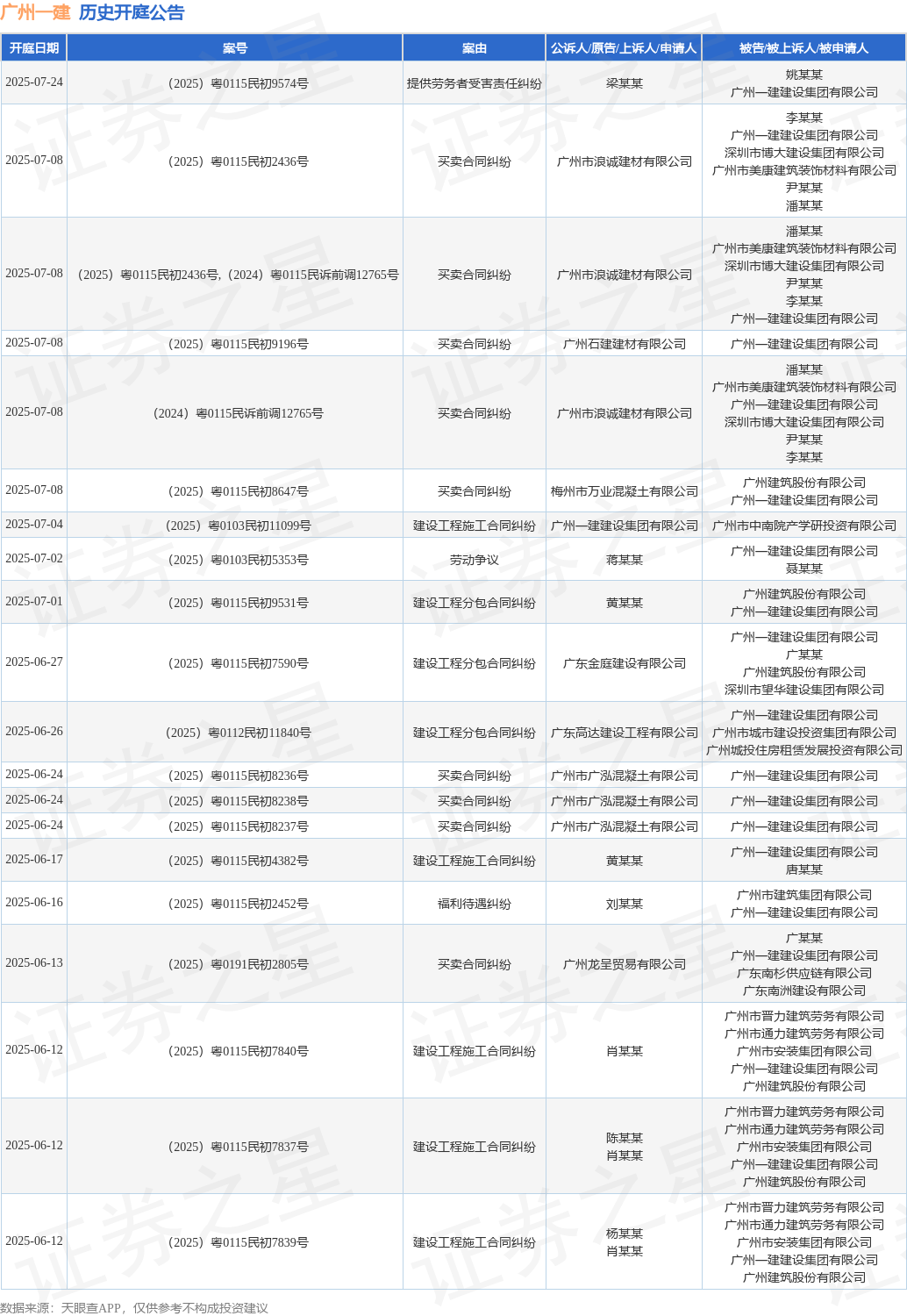 案号:(2025)粤0115民初4382号审理法院:广州市南沙区人民法院案由:建设工程施工合同纠纷当事人信息: 原告/上诉人:黄某某 被告/被上诉人:广州一建建设集团有限公司、唐某某开庭日期:2025年6月17日根据统计,近一年内以广州一建建设集团有限公司为当事人的历史开庭公告有91则,其中案由为“买卖合同纠纷”的公告以38则居首,其次为“建设工程施工合同纠纷”有17则,“建设工程分包合同纠纷”有13则。历史开庭公告(前20条)如下:
